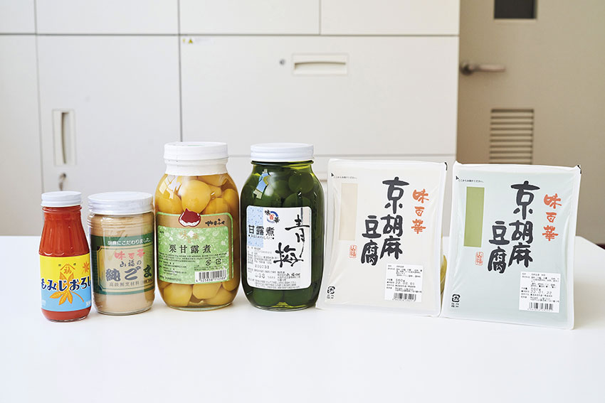 From left to right: Chili pepper paste (for Momiji oroshi); Sesame paste; Kuri-kanro (Chestnuts in syrup); Ume-kanro (Plums in syrup); Goma-tofu white/matcha