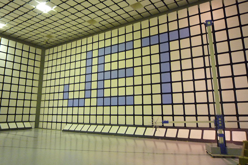 Electromagnetic Compatibility (EMC) semi-anechoic chamber, a specialized laboratory environment used to test electronic devices.