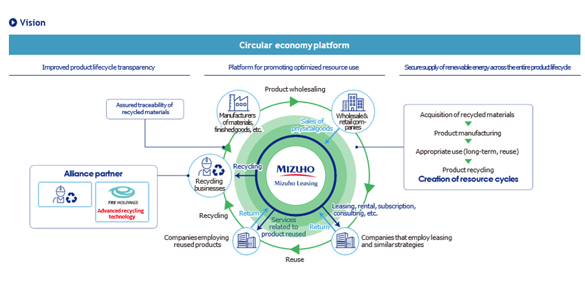 Traditionally, in a linear economy, products are manufactured, used, and then disposed of as waste. Under the circular model, recyclable materials are recovered and reintroduced into production. Mizuho Leasing, in collaboration with TREHOLDINGS, Mizuho Financial Group, and manufacturing partners, is helping to design the systems that make this possible.