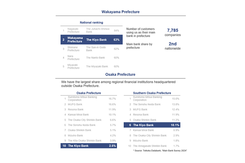 In Wakayama, we hold a dominant position—63% of businesses in the prefecture consider us their main banking partner. That’s a very high share, and it contributes to the stability of Kiyo Bank. On the other hand, while more than half of Kiyo Bank’s outstanding loans are in the Osaka area, our market share within Osaka Prefecture remains relatively low. Therefore, we believe there is room to further expand our share.